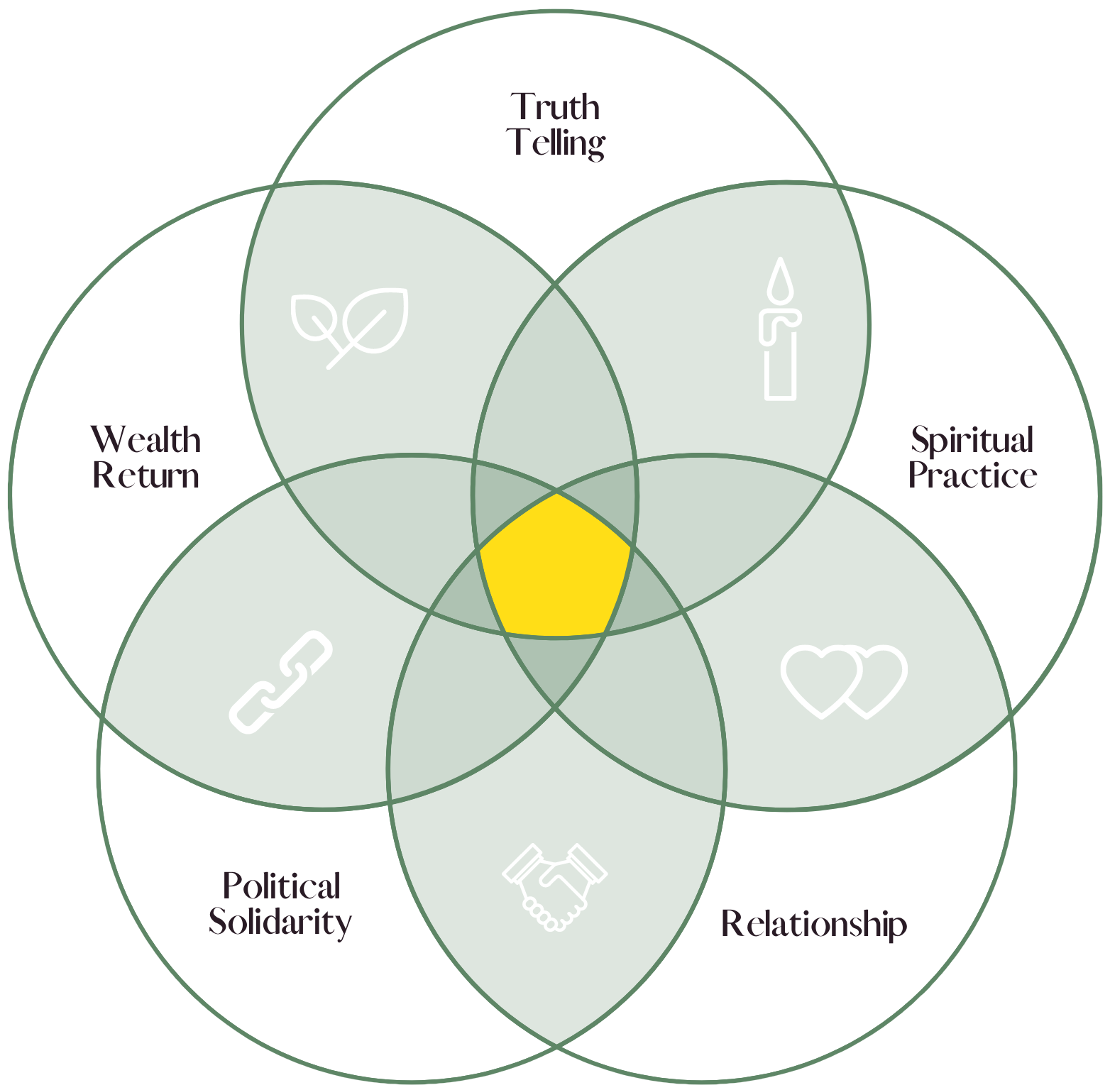At the heart of SACRED RECKONINGS is a Reparatory Eco Map. This interconnected ecosystem includes Truth Telling, Spiritual Practice, Relationship, Political Solidarity, and Wealth Return. The work of reparation and repair is an ongoing process that invites us into each of these topics again and again.
